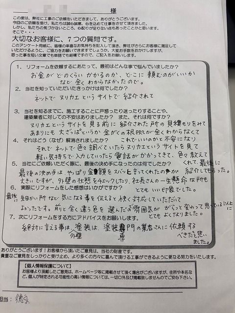 最後の決め手はやっぱり金額をズバッと言ってくれたのが大きいですが、外壁の状態をチェックしたり社長さんの一生懸命な所もとてもいい印象でした。